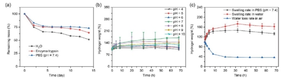 溶脹機制,水凝膠吸水能力受交聯(lián)密度和化學組成影響。PBS中離子滲透可延緩溶脹平衡,而高極性水分子加速降解。PGS水凝膠的pH響應性與保水性能結(jié)果表明,①pH依賴性溶脹行為:溶脹率呈鐘形曲線:pH=7時達峰值(1.4),在酸堿環(huán)境中均降低;②跨生理pH穩(wěn)定性:在口腔(pH 6.6-7.1)、血液(pH 7.4)等生理環(huán)境中保持穩(wěn)定溶脹;③優(yōu)異保水能力:30小時內(nèi)快速吸水達70%飽和度,隨后保持平衡。