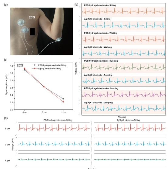 該研究成功開發(fā)了一種基于丙烯酸(AA)與絲素蛋白(SF)的雙網(wǎng)絡(luò)水凝膠,兼具優(yōu)異力學性能、粘附性能和生物相容性。PGS水凝膠為可穿戴設(shè)備提供了新的機會??梢杂米髯哉承陨韺щ娔z,以準確記錄心電圖(ECG),肌電圖(EMG)等。此外,可以將PGS水凝膠發(fā)展為運動傳感器,能夠收集有關(guān)組織運動和監(jiān)測組織狀態(tài)的數(shù)據(jù)。該研究為設(shè)計和構(gòu)建用于生物醫(yī)學應用的多功能SF水凝膠提供了有效的策略。