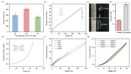 通過不同配比(SF:PAA = 5:5~9:1)研究PGS水凝膠的拉伸、壓縮及斷裂特性。結(jié)果表明:①力學性能可調(diào),當SF:PAA=7:3時,斷裂強度最高(312 kPa);配比為8:2時,拉伸應變最大(424.6%)。②組織相容模量,拉伸模量(0.4 kPa)與壓縮模量(107 kPa)與軟組織匹配,適合生物醫(yī)學應用。③優(yōu)異回彈性,50%應變下幾乎無機械滯后,8次循環(huán)后強度保持率≈98%,歸因于PAA-SF雙網(wǎng)絡(luò)的協(xié)同作用。