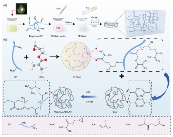 作為一種蛋白質(zhì)材料,SF具有含有活性氨基酸(-NH2)的氨基酸殘基,而甲基丙烯酸乙二酯(GMA)的環(huán)氧基群可以在SF上與氨基組形成共價鍵。這里的SF通過甲基丙烯酸酯基成功激活。其次,用GMA接枝的SF與AA(丙烯酸)的光聚合反應。同時添加了α-酮酮谷氨酸(KGA)引發(fā)劑,以啟動SF和AA單體上甲基丙烯酸酯基團的自由基聚合,以形SF水凝膠。