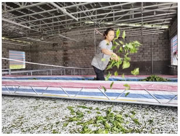 半自動喂蠶車——省時省力效率高。在清潭村,90%的農(nóng)戶以養(yǎng)蠶為業(yè)。走進清潭村小思冬屯蠶農(nóng)黃大源的蠶房,只見黃大源和家人熟練地把剛從地里采摘回來的桑葉倒入裝有滑輪的喂蠶車,喂蠶車緩緩移動,他和家人站在喂蠶車上,均勻地將桑葉撒喂給蠶蟲。黃大源告訴記者:“以前我們是踩著磚頭,用背簍裝桑葉來喂蠶,現(xiàn)在用喂蠶車,喂蠶時間縮短了一半?!?/p>