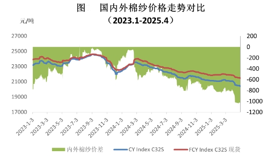 4月,美國(guó)加征關(guān)稅政策持續(xù)升級(jí),紡織品服裝外貿(mào)訂單大量暫?;蛉∠?,給出口企業(yè)造成沖擊,下游客戶觀望情緒濃厚,東南亞服裝工廠訂單同步下滑,間接影響國(guó)內(nèi)紗線出口,企業(yè)后市信心普遍不足。月內(nèi)有關(guān)部門出臺(tái)了一系列促消費(fèi)政策,內(nèi)銷市場(chǎng)雖保持一定韌性,但增長(zhǎng)低于預(yù)期,拉動(dòng)上游有效需求不足,成品庫存有所累積,部分企業(yè)下調(diào)了開機(jī)率,預(yù)計(jì)隨著進(jìn)入傳統(tǒng)淡季,限產(chǎn)減產(chǎn)現(xiàn)象將進(jìn)一步增加。據(jù)中國(guó)棉花預(yù)警系統(tǒng)對(duì)全國(guó)90余家定點(diǎn)紡織企業(yè)調(diào)查顯示,本月紡織品產(chǎn)量環(huán)比略有下降,紗線價(jià)格下跌、庫存增加,原料庫存穩(wěn)中略降。