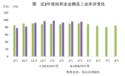 月內(nèi)棉花價(jià)格承壓下跌,部分企業(yè)低位適當(dāng)補(bǔ)庫,然而關(guān)稅風(fēng)險(xiǎn)下企業(yè)信心不足,總體原料庫存穩(wěn)中略降。據(jù)調(diào)查,截至4月底紡織企業(yè)在庫棉花工業(yè)庫存量為95.4萬噸,環(huán)比減少0.5萬噸。其中:27%的企業(yè)增加棉花庫存,30%減少庫存,43%基本保持不變。