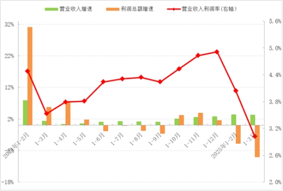 一季度,受市場競爭加劇、綜合成本上漲以及出口價格下跌等多重因素影響,服裝行業(yè)雖營業(yè)收入有所增長,但盈利嚴(yán)重承壓,運行效率放緩。根據(jù)國家統(tǒng)計局?jǐn)?shù)據(jù),1-3月,我國服裝行業(yè)規(guī)模以上(年主營業(yè)務(wù)收入2000萬元及以上)企業(yè)13656家,實現(xiàn)營業(yè)收入2806.78億元,同比增長3.30%,比2024年全年加快0.54個百分點;利潤總額84.80億元,同比下降10.07%,比2024年全年下滑11.61個百分點;營業(yè)收入利潤率為3.02%,同比下降0.45個百分點,低于2024年全年1.89個百分點。