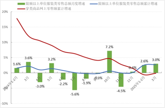 一季度,在國內(nèi)宏觀經(jīng)濟平穩(wěn)向好、促消費政策發(fā)力顯效以及春節(jié)假期效應(yīng)等因素的支撐下,我國服裝內(nèi)銷市場實現(xiàn)溫和增長。根據(jù)國家統(tǒng)計局?jǐn)?shù)據(jù),1-3月,我國限額以上單位服裝類商品零售額累計2835.1億元,同比增長2.7%,增速比2024年全年加快2.6個百分點。其中,3月當(dāng)月限額以上單位服裝類商品零售額同比增長3.0%,增速比1-2月加快0.4個百分點。同期,線上服裝銷售出現(xiàn)小幅波動,穿類商品網(wǎng)上零售額同比下降0.1%,降幅比1-2月收窄0.5個百分點。