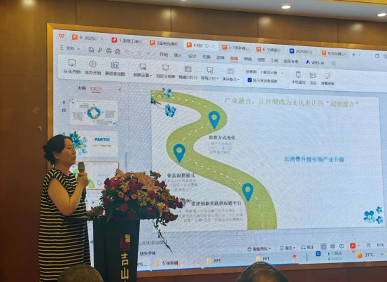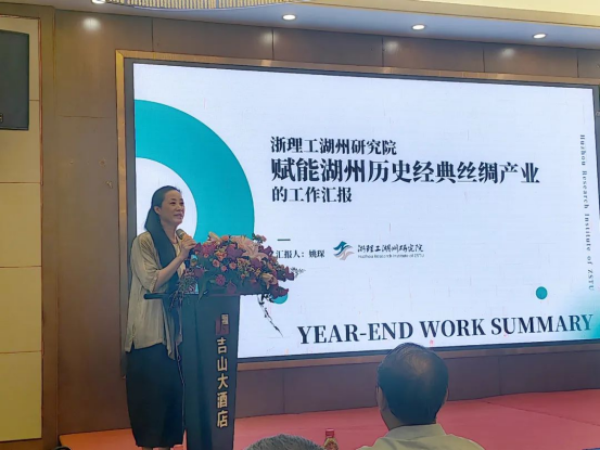 姚院長從浙理工湖州研究院的重大活動(dòng)開展、產(chǎn)業(yè)服務(wù)實(shí)踐、人才引育成果及國際交流合作等四個(gè)維度,詳細(xì)闡述了研究院賦能湖州歷史經(jīng)典絲綢產(chǎn)業(yè)的創(chuàng)新實(shí)踐與工作成效。同時(shí),她著重介紹了研究院在數(shù)字創(chuàng)新服務(wù)平臺(tái)建設(shè),打造長三角·南潯絲綢文化產(chǎn)業(yè)園建設(shè)、蠶桑文化研究與國風(fēng)生活表達(dá)、產(chǎn)鄉(xiāng)融合和研學(xué)對(duì)話、產(chǎn)業(yè)對(duì)接雙向奔赴等方面的重要舉措,推動(dòng)湖州絲綢產(chǎn)業(yè)的全方位發(fā)展。