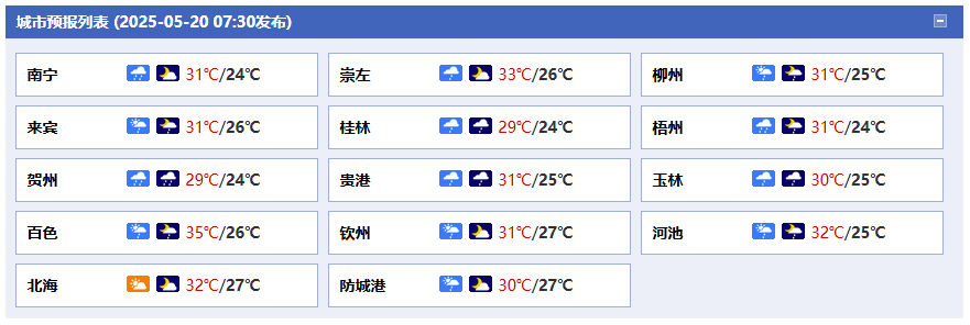 南寧市:今天白天,多云有中雨、局地大雨,今天晚上,多云、局地有陣雨或雷雨,偏南風2~3級,最高氣溫31℃,最低氣溫24℃。