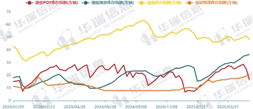 化纖庫存在2024年末較好去化后,一季度大部分子行業(yè)庫存水平低位回升(圖2)。以滌綸長絲為例,春節(jié)后,下游裝置陸續(xù)重啟,但主要以消化節(jié)前備貨原料為主,行業(yè)產(chǎn)銷持續(xù)偏弱,工廠庫存累積;3月以來,下游加彈、織造開機(jī)不及旺季預(yù)期,行業(yè)產(chǎn)銷以階段式脈沖放量為主,工廠庫存總體呈持續(xù)累積。4月下旬,滌綸長絲價(jià)格相對低位,部分下游投機(jī)備貨,工廠庫存有所去化。分產(chǎn)品看,一季度,滌綸POY平均庫存19天,與2024年同期基本持平;錦綸平均庫存24天,較2024年同期提升7.6天;氨綸平均庫存49天,仍在高位震蕩,庫存壓力較大。