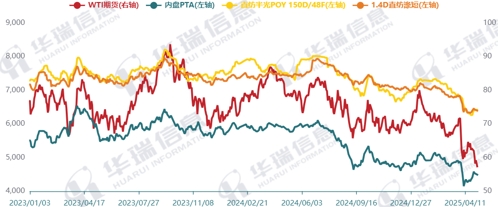 2025年以來,在供需不平衡、地緣沖突、全球經(jīng)濟(jì)復(fù)蘇乏力以及關(guān)稅政策變化和避險(xiǎn)情緒升溫等因素共同作用下,原油價(jià)格震蕩下行,化纖主要產(chǎn)品及原料價(jià)格跟隨呈現(xiàn)下跌趨勢(圖3)。至4月末,原油價(jià)格跌幅17.38%、PTA價(jià)格跌幅6.39%、滌綸POY價(jià)格跌幅9.13%、滌綸短纖價(jià)格跌幅8.47%,其中PTA價(jià)格跌幅較原油價(jià)格跌幅稍小,以現(xiàn)價(jià)來看,PTA加工差有所擴(kuò)大。