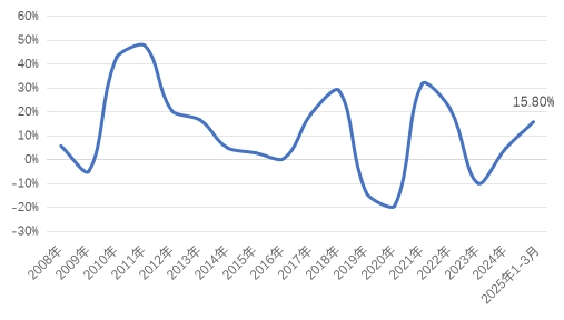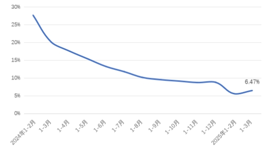 產(chǎn)量方面,國家統(tǒng)計(jì)局?jǐn)?shù)據(jù)顯示,2025年1-3月化纖產(chǎn)量為2063萬噸,同比增長6.47%,產(chǎn)量增速較2024年同期和全年均有所放緩(圖1)。