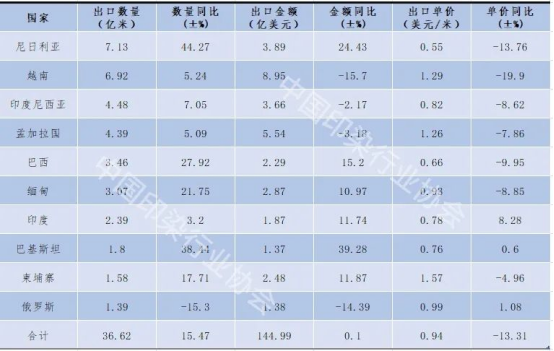 我國(guó)印染行業(yè)對(duì)主要市場(chǎng)的出口呈現(xiàn)量增價(jià)跌態(tài)勢(shì)。一季度,我國(guó)印染八大類(lèi)產(chǎn)品對(duì)東盟和RCEP貿(mào)易國(guó)出口數(shù)量分別增長(zhǎng)8.59%和8.45%,出口平均單價(jià)分別下滑13.65%和13.14%,降幅均高于行業(yè)出口平均水平。出口數(shù)量排名前十的國(guó)家中,僅對(duì)俄羅斯出口數(shù)量出現(xiàn)下滑,對(duì)其余國(guó)家出口數(shù)量均實(shí)現(xiàn)不同程度增長(zhǎng),其中對(duì)尼日利亞出口數(shù)量同比增幅達(dá)到44.27%,主要得益于當(dāng)?shù)卣掷m(xù)推進(jìn)的一系列改革措施,包括彌補(bǔ)收入流失、強(qiáng)化機(jī)構(gòu)間合作以及推動(dòng)貿(mào)易主體自愿遵守法規(guī)等;對(duì)巴西、緬甸、巴基斯坦出口數(shù)量增速均超過(guò)20%。從出口平均單價(jià)來(lái)看,對(duì)前十國(guó)家出口單價(jià)平均下降13.31%,其中對(duì)越南出口單價(jià)下降最為明顯,降幅接近20%,對(duì)印度、巴基斯坦和俄羅斯出口單價(jià)有所增長(zhǎng)。