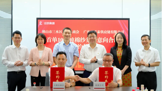 會上,三水區(qū)大塘鎮(zhèn)總商會與絲紡集團所屬企業(yè)泓泰供應鏈公司簽訂戰(zhàn)略合作協議以及首單1000噸棉紗銷售意向合同。