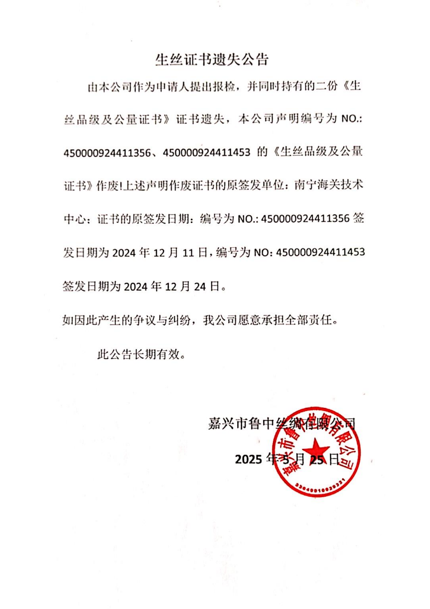 生絲證書遺失公告(2025年5月25日)