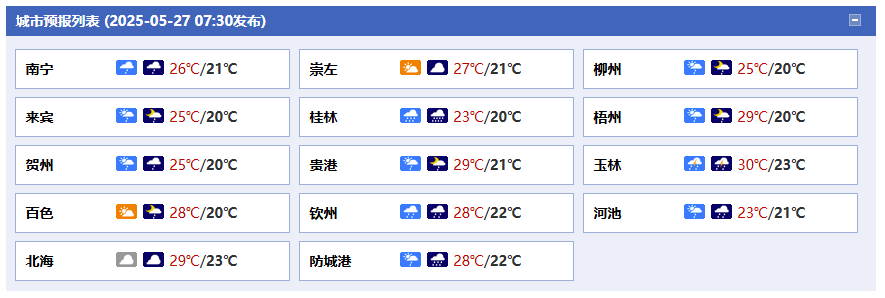 預計今天白天到晚上,桂林、柳州、河池三市北部、百色東部、防城港等市有大雨到暴雨、局地大暴雨并伴有短時雷暴大風等強對流天氣,其它地區(qū)有陣雨或雷雨、局地大雨到暴雨。28日白天到晚上,桂東、桂南部分地區(qū)有暴雨、局地大暴雨并伴有短時雷暴大風等強對流天氣,其它地區(qū)有中雨到大雨、局地暴雨。29日白天到晚上,桂東南及沿海地區(qū)陰天有小到中雨、局地大雨或暴雨,其它地區(qū)有陣雨或雷雨。