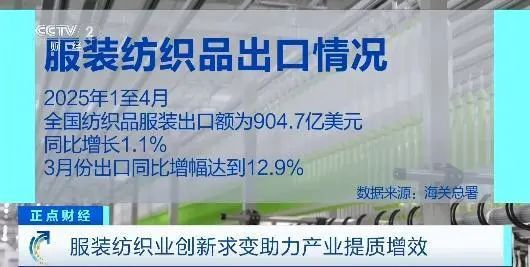 業(yè)內(nèi)人士表示,技術(shù)迭代、產(chǎn)品創(chuàng)新,帶動(dòng)了我國(guó)紡織行業(yè)的持續(xù)增長(zhǎng)。今年1至4月,全國(guó)紡織品服裝出口額為904.7億美元,同比增長(zhǎng)1.1%,其中,3月份出口同比增長(zhǎng)加速,增幅達(dá)到12.9%。