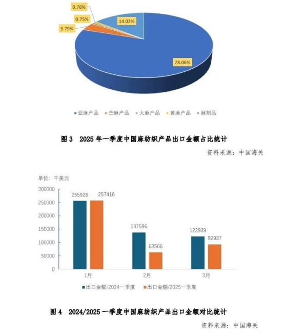 根據(jù)中國海關(guān)數(shù)據(jù)統(tǒng)計(jì),2025年一季度中國麻紡織產(chǎn)品出口額4.44億美元,與2024年同比下降16.36%。其中,亞麻纖維紗線面料和麻制品出口金額分別占比78.06%和14.02%。苧麻纖維紗線和面料出口金額占比3.79%,大麻纖維紗線和織物出口金額占比0.75%,黃麻紗線和織物出口金額占比0.76%。見圖3、圖4