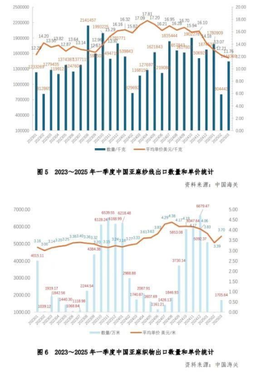 另據(jù)國家統(tǒng)計(jì)局?jǐn)?shù)據(jù),2025年一季度麻紡織及染整精加工規(guī)模以上企業(yè)生產(chǎn)亞麻布(含亞麻≥50%)6090萬米,與2024年同比增長1.64% ;生產(chǎn)苧麻布(含苧麻≥50%)825萬米,與2024年同比增長3.57%。