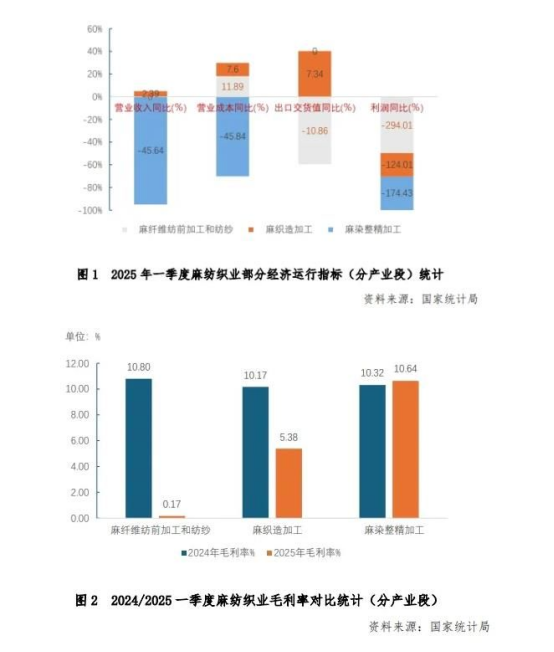 面對外部壓力加大、內(nèi)部困難猶存的復(fù)雜形勢,加之歐洲亞麻2023年歉收和2024年豐收導(dǎo)致的亞麻原料價(jià)格劇烈波動留下的“后遺癥”(高價(jià)原料去庫存),以及受2024年高基數(shù)影響,2025年一季度,中國麻紡織行業(yè)經(jīng)濟(jì)運(yùn)行不及預(yù)期,經(jīng)濟(jì)效益大幅度下滑。主要經(jīng)濟(jì)效益指標(biāo)和進(jìn)出口額均有不同程度的下降,但行業(yè)企業(yè)資本保值增值率、“三費(fèi)”比例和內(nèi)銷市場表現(xiàn)不錯。具體情況如下:
