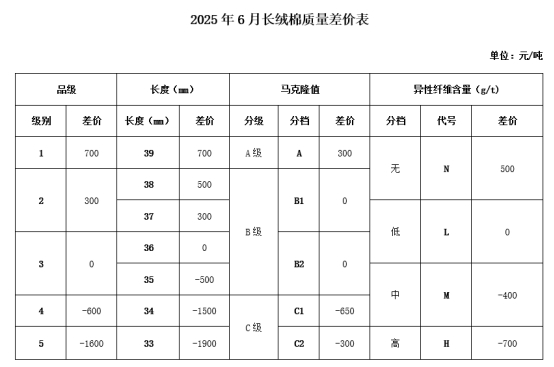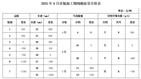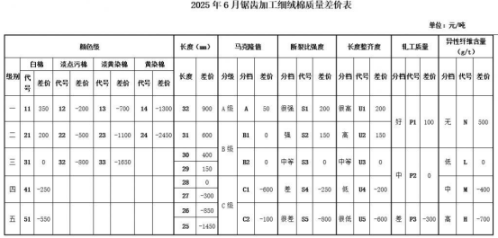 根據(jù)《中國棉花協(xié)會國產棉質量差價表管理辦法》規(guī)定,現(xiàn)正式發(fā)布2025年6月《鋸齒加工細絨棉質量差價表》、《皮輥加工細絨棉質量差價表》和《長絨棉質量差價表》(單位:元/噸)。