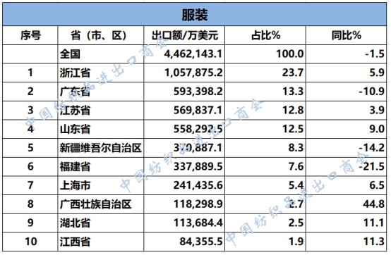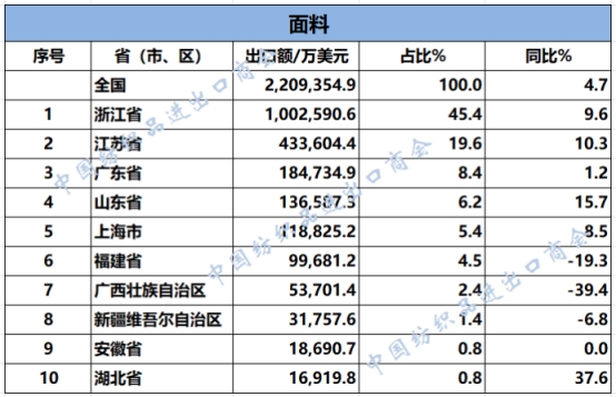 2025年1-4月紡織服裝類重點(diǎn)商品出口前十名的省(市、區(qū))