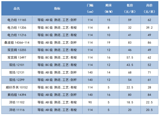 本周綢緞指數(shù)協(xié)作單位成交價格區(qū)間