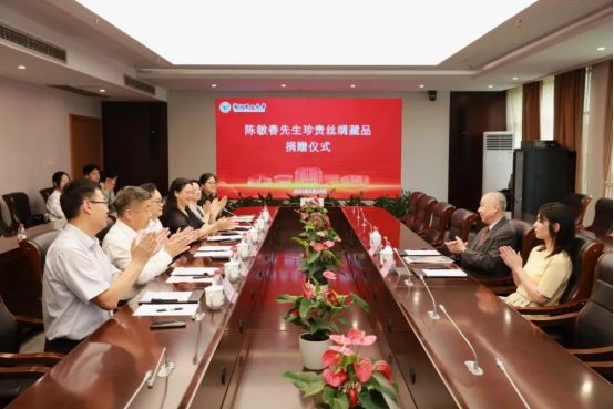 5月28日上午,陳敏春先生珍貴絲綢藏品捐贈儀式在浙江理工大學行政樓308會議室舉行。FNT基金會主席、香港寶通華行有限公司董事陳敏春,浙江理工大學黨委副書記繆魯加,校黨委委員、黨委宣傳部部長高麗靜,杭州宇稱電子技術有限公司文物成像部主任侯然等出席儀式。儀式前,浙江理工大學黨委書記趙全軍會見了陳敏春先生一行。