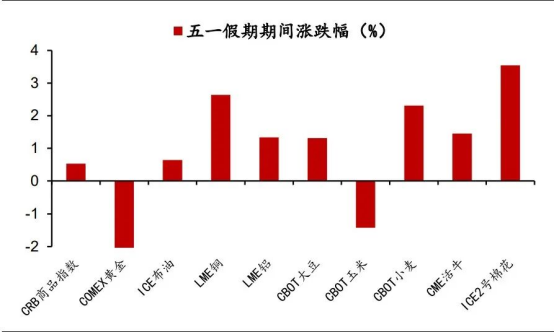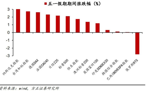 五一假期期間,除俄羅斯RTS指數(shù)(-2.8%)外,全球主要經(jīng)濟(jì)體股票指數(shù)均錄得正收益。