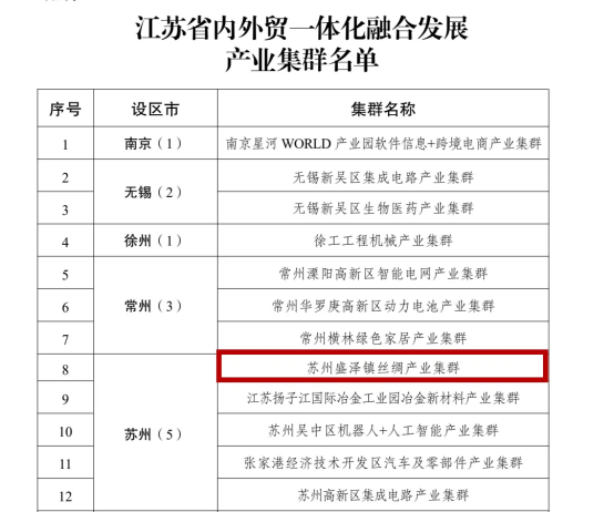 其中,蘇州盛澤鎮(zhèn)絲綢產(chǎn)業(yè)集群入選省內(nèi)外貿(mào)一體化融合發(fā)展產(chǎn)業(yè)集群。