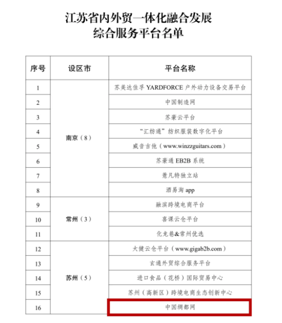 近日,江蘇省商務(wù)廳發(fā)布江蘇省內(nèi)外貿(mào)一體化融合發(fā)展綜合服務(wù)平臺和產(chǎn)業(yè)集群名單。