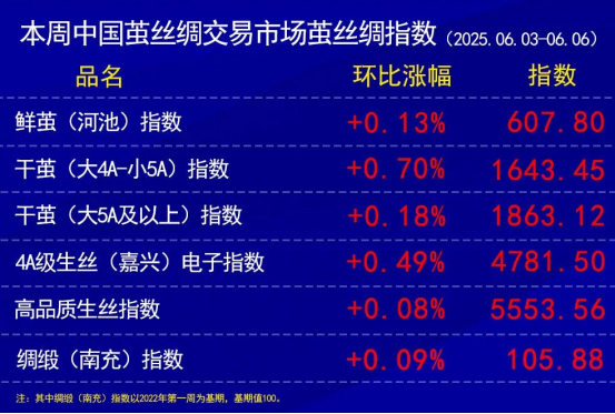 干繭價(jià)格指數(shù):本周兩個(gè)等級(jí)的干繭價(jià)格指數(shù)均較上周小幅收紅。云南、四川等傳統(tǒng)干繭調(diào)出地區(qū)多處于春繭收烘入庫(kù)和抽樣報(bào)價(jià)階段,預(yù)計(jì)后期貿(mào)易量將逐步增加。