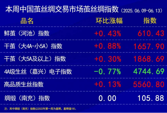 高品質(zhì)生絲上,協(xié)作單位反饋本周成交活躍度較上周有些下降,但經(jīng)指數(shù)模型計(jì)算,指數(shù)環(huán)比仍延續(xù)略漲勢(shì)。