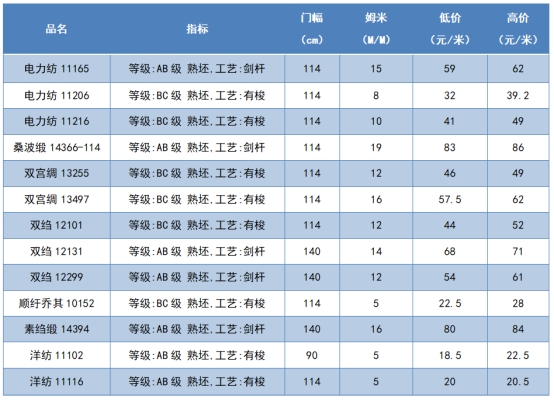 本周綢緞指數(shù)協(xié)作單位成交價(jià)格區(qū)間