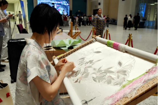 中國工藝美術(shù)大師林霞為現(xiàn)場觀眾展示臺繡非遺技藝。來自浙江南部地區(qū)的臺州刺繡歷史悠久,吸收融合西方抽紗工藝,繡品不但立體感強且鏤空部分更是玲瓏剔透、獨具風(fēng)格,在中國刺繡工藝上獨樹一幟。