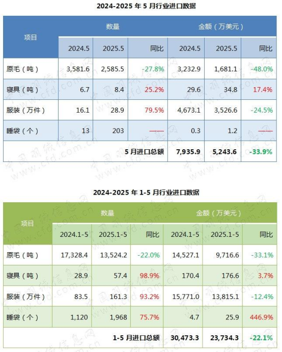 1-5月,行業(yè)進口總額2.4億美元,同比下降22.1%,環(huán)比1-4月降幅擴大4.1個百分點。其中,原毛進口額同比下降33.1%;服裝進口數(shù)量雖然增長明顯,漲幅達93.2%,但進口金額卻減少了12.4%。