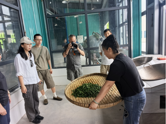在非遺炒茶工坊,新鮮采摘的桑葉需在2-5小時內(nèi)完成萎凋工序,賡續(xù)完成殺青工序。非遺傳承人在高溫熱風設備蒸騰的霧靄中,以炒茶鍋為舞臺,配合“三殺三揉+低溫烘焙”傳統(tǒng)工藝為大家呈現(xiàn)了一場優(yōu)雅的指尖茶韻“交響曲”,清香逐步沉淀,轉(zhuǎn)為醇厚的焦香和回甜,泡制的茶葉其“清雅甘醇”的口感也引得探訪團隊頻頻點贊。而中國桑都文化展示館內(nèi),從近代桑蠶畫像到現(xiàn)代桑枝菌培育技術(shù)的演變歷程,全景呈現(xiàn)了樂至“千年蠶桑之鄉(xiāng)”的文化厚度。