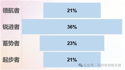 頭部企業(yè)引領(lǐng)效應(yīng)顯著:“領(lǐng)航者”企業(yè)占比21%,樹立行業(yè)標(biāo)桿;“銳進(jìn)者”占比最高(36%),展現(xiàn)強(qiáng)勁勢(shì)頭;“蓄勢(shì)者”和“起步者”分別占比23%和21%。