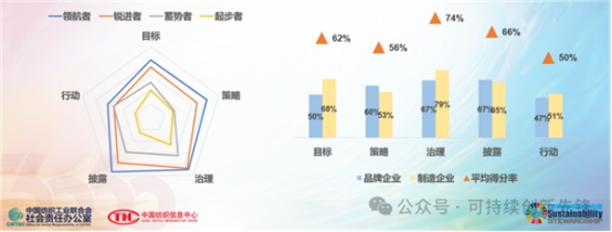 “治理”“披露”領(lǐng)先,“行動(dòng)”需要繼續(xù)加強(qiáng):五大維度中,“治理”(平均得分率74%)和“披露”(66%)表現(xiàn)相對(duì)較好?!靶袆?dòng)”維度平均得分率僅為50%,即使是“領(lǐng)航者”企業(yè)也僅為63%。制造企業(yè)整體得分率略高于品牌企業(yè)。品牌企業(yè)在“策略”和“披露”稍具優(yōu)勢(shì),制造企業(yè)在“治理”“目標(biāo)”和“披露”得分率居前。