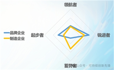 品牌與制造表現(xiàn)差異:制造企業(yè)整體行動(dòng)率更高。品牌企業(yè)在“領(lǐng)航者”層級(jí)占比(約20%)與制造企業(yè)相近,“銳進(jìn)者”比例(43%)顯著高于制造企業(yè)(32%)。但品牌企業(yè)存在一定“兩極分化”,29%仍處于“起步者”階段;制造企業(yè)在后進(jìn)梯隊(duì)中則以“蓄勢(shì)者”為主,“起步者”比例較低(16%)。
