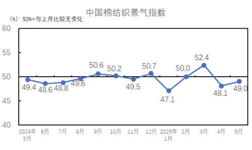 中國棉紡織景氣指數(shù)回升。5月中國棉紡織景氣指數(shù)為49.0%,低于臨界點,較4月上升0.9個百分點。5月,隨著《中美日內(nèi)瓦經(jīng)貿(mào)會談聯(lián)合聲明》的發(fā)布,宏觀氛圍轉(zhuǎn)好,棉花、棉紗價格出現(xiàn)回升,但市場依舊維持淡季行情,下游需求恢復(fù)有限,景氣指數(shù)回升幅度有限,依舊處榮枯線以下。從分項指數(shù)看,構(gòu)成中國棉紡織景氣指數(shù)的7個分項指數(shù)中企業(yè)信心指數(shù)處臨界點,其余指數(shù)均低于臨界點,其中原料庫存指數(shù)、產(chǎn)品庫存指數(shù)較4月出現(xiàn)下降,其余指數(shù)較4月出現(xiàn)上升。