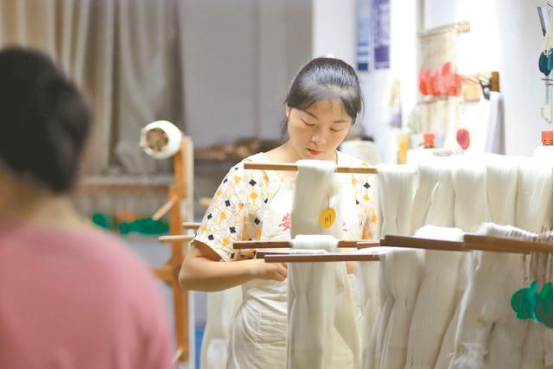 車間里,自動(dòng)繅絲機(jī)正有條不紊地運(yùn)轉(zhuǎn),繅絲、編檢、整理、打包……“織女”們各司其職,趕制這批外貿(mào)訂單。
