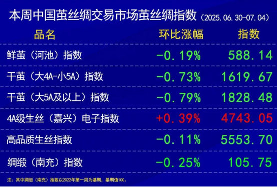今日(2025年07月04日,周五)中國繭絲綢交易市場生絲電子指數(shù)微跌0.07%報(bào)收于4743.05點(diǎn),本周生絲指數(shù)累計(jì)上漲0.39%。B絲2022D(商檢4A級(jí)生絲):250725合約報(bào)平收于47.10萬元;250925合約下跌0.18萬元報(bào)收于47.40萬元;260325下跌0.09萬元報(bào)收于47.97萬元。