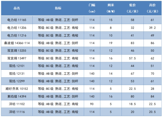 本周綢緞指數(shù)協(xié)作單位成交價(jià)格區(qū)間