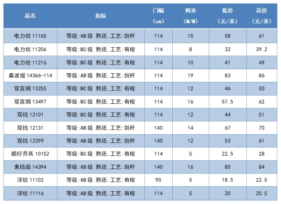 本周綢緞指數(shù)協(xié)作單位成交價格區(qū)間