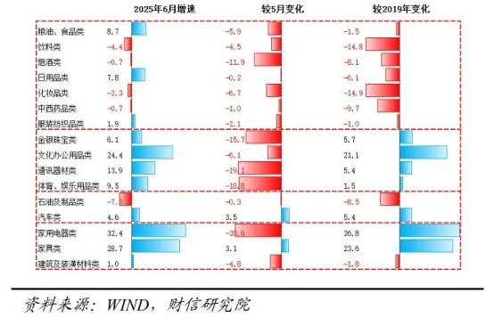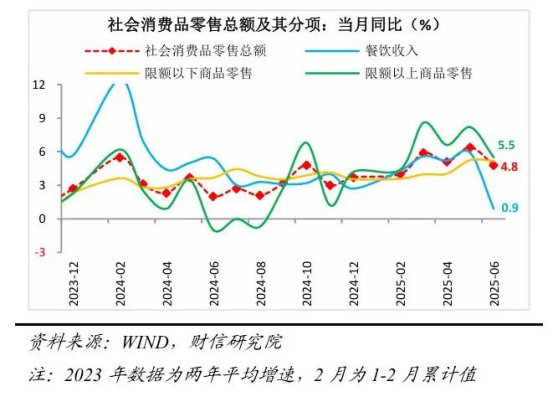 上半年社會消費(fèi)品零售總額同比增長5.0%,較去年全年提高1.5個(gè)百分點(diǎn),總體保持較好恢復(fù)態(tài)勢。但6月當(dāng)月社零同比增長4.8%,在去年基數(shù)大幅走低的基礎(chǔ)上(2024年6月社零增速較上月回落1.7個(gè)百分點(diǎn)至2.0%),仍較上月回落1.6個(gè)百分點(diǎn);環(huán)比增長-0.16%,創(chuàng)歷史同期最差表現(xiàn),消費(fèi)邊際放緩較多。