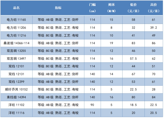 本周綢緞指數(shù)協(xié)作單位成交價(jià)格區(qū)間