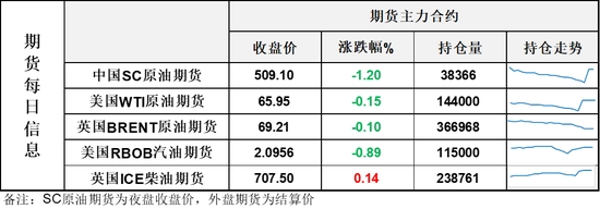 【1】WTI主力原油期貨收跌0.1美元,跌幅0.15%,報(bào)65.95美元/桶;布倫特主力原油期貨收跌0.07美元,跌幅0.1%,報(bào)69.21美元/桶;INE原油期貨收跌1.2%,報(bào)509.1元。