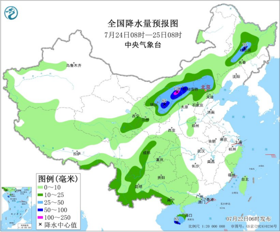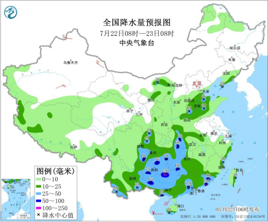 圖3 全國降水量預(yù)報(bào)圖(7月22日08時(shí)-23日08時(shí))