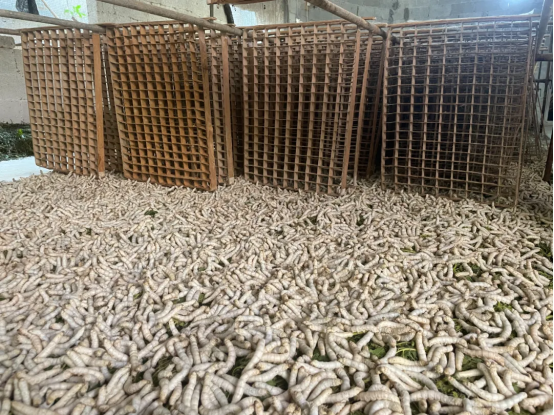7月17日,記者在石別鎮(zhèn)土橋村新村屯養(yǎng)蠶戶郭孟佳家中看到,他正在為即將上蔟的蠶蟲整齊擺放好方格蔟,以便蠶蟲上蔟結(jié)繭。郭孟佳告訴記者,由于今年鮮繭收購價格每斤最高可達(dá)到34元,所以今年的養(yǎng)蠶收入也較為可觀?!靶Q種比較好,質(zhì)量比較過關(guān),我們也養(yǎng)得好,上半年養(yǎng)了七批,(產(chǎn)量)在1300斤左右,因為今年(蠶繭收購)的價錢比往年高,所以今年養(yǎng)得好,價錢高,收入也可以。”養(yǎng)蠶戶郭孟佳說。