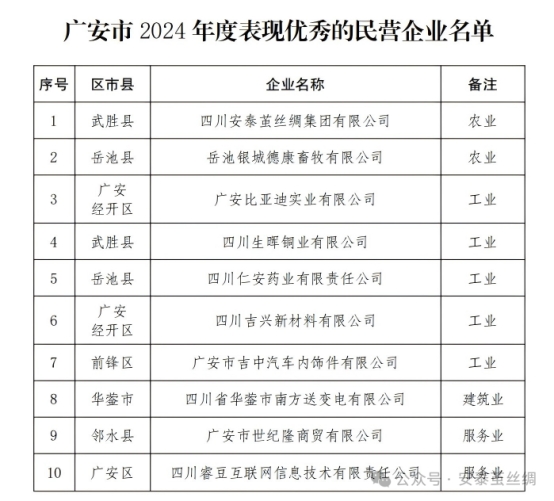 近日,廣安市 2024 年度表現(xiàn)優(yōu)秀的民營(yíng)企業(yè)名單正式公布,四川安泰繭絲綢集團(tuán)有限公司憑借在農(nóng)業(yè)領(lǐng)域的突出表現(xiàn),作為武勝縣唯一入選的農(nóng)業(yè)企業(yè)光榮上榜,這份來(lái)自中共廣安市委辦公室、廣安市人民政府辦公室的通報(bào)表?yè)P(yáng),是對(duì)企業(yè)過(guò)去一年深耕主業(yè)、助力地方發(fā)展的高度肯定。