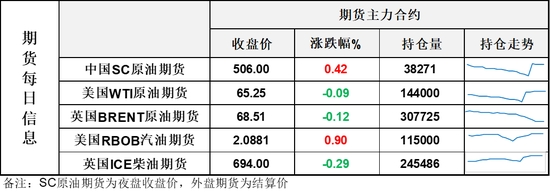【1】WTI主力原油期貨收跌0.06美元,跌幅0.09%,報(bào)65.25美元/桶;布倫特主力原油期貨收跌0.08美元,跌幅0.12%,報(bào)68.51美元/桶;INE原油期貨收漲0.42%,報(bào)506元。